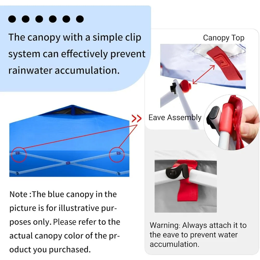EZ CLIP CANOPY FABRIC - The new clip system easily attaches the canopy fabric to the frame. The silver-coated interior provides UPF 50+ UV protection, ensuring cooler and safer shade. Made from rugged 150D fabric, the canopy is water-resistant and flame-resistant (CPAI-84). Integrated air vents and the EZ clip system prevent wind lift and rain pooling, reducing fabric tearing risks. A 150D sidewall with organizer pockets is included to block sunlight from the side, ideal for outdoor events.